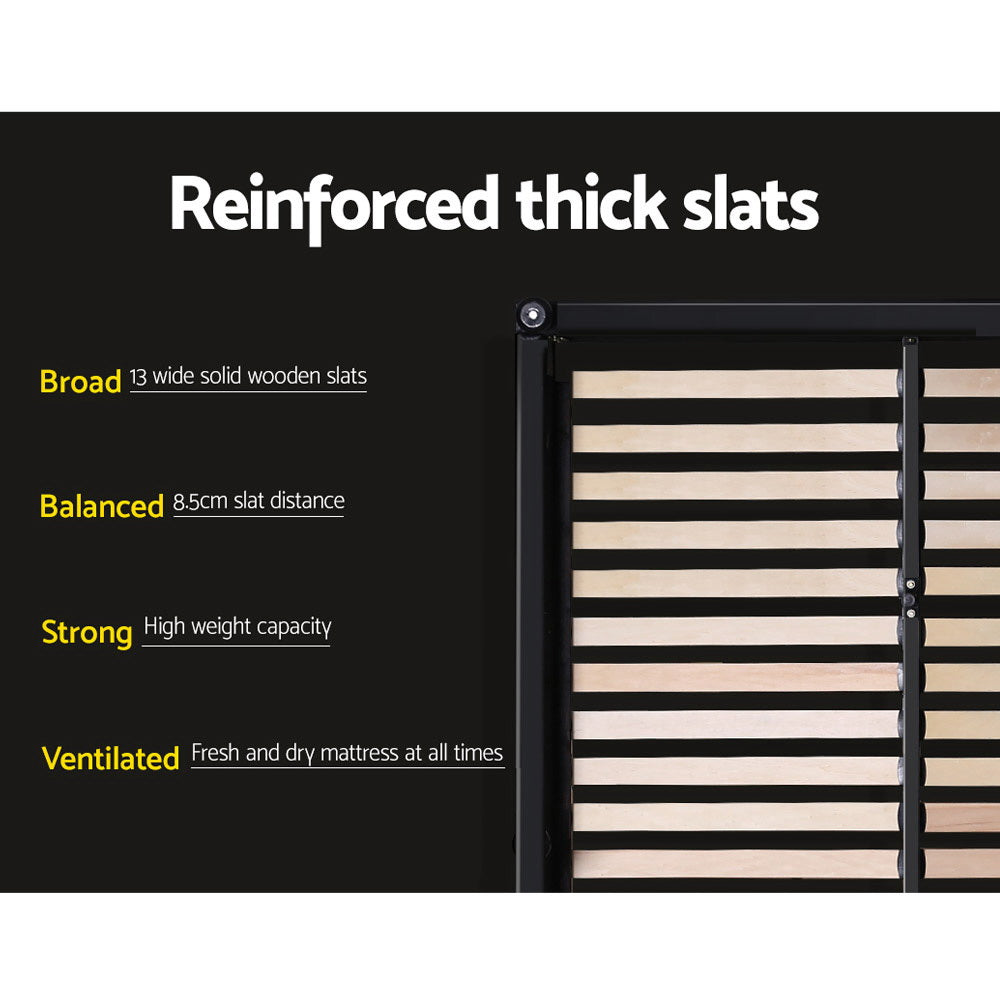 Constructed with a sturdy steel frame that's reinforced with metal bars and heavy-duty connectors, the Mila Bed Frame is also padded with high density foam and upholstered in premium faux linen fabric for a soft and comfortable touch. The Bed Frame features a wooden arched slat base that helps to distribute weight evenly across the frame and a centre support strut to provide added stability to the overall structure.