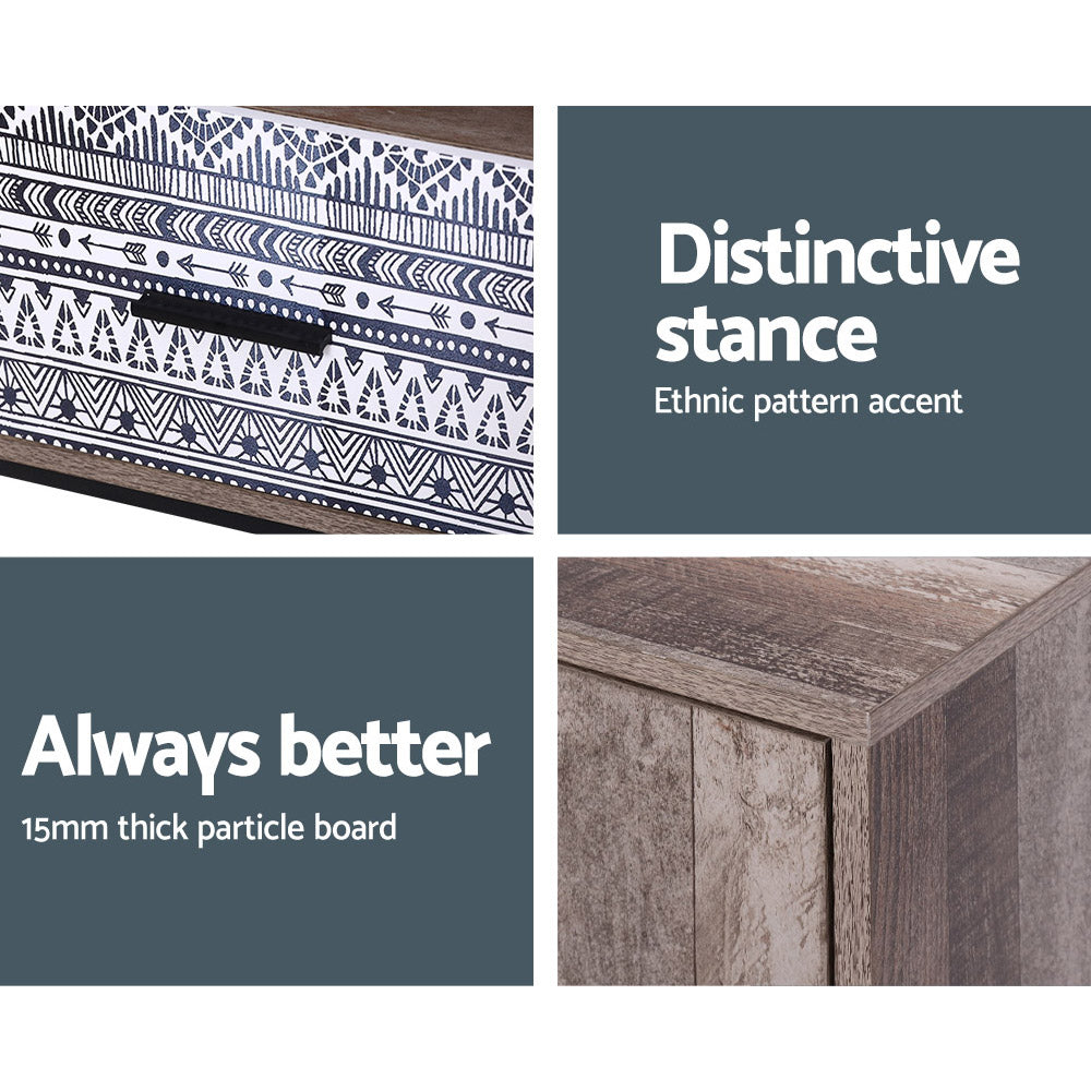 Your treasured home entertainment system deserves the best cabinet for it. And that is why our Artiss Marca Entertainment Unit is the ideal choice for you. Incorporating a contemporary industrial-look design and presented with 15mm thick E1 particle board with durable powder-coated steel tube base that provides an eclectic touch, our entertainment unit displays great craftsmanship with equally fine hardware to ensure trouble-free use every time. There are even two extra supporting legs attached to the base for a steady and firm stand at all times. The unit offers ample storage space with one open shelf, two deep cabinets with magnetic door catches, and one spacious accent drawer with anti-rust runners and beautiful ethnic-pattern front for all your entertainment essentials. Better still, the ensemble features black metal handles on drawer and cabinets to maintain the sleek yet industrial appearance. With a design that will surpass trends and fads, our entertainment unit is your definite pick of an everlasting display piece with timeless appeal.