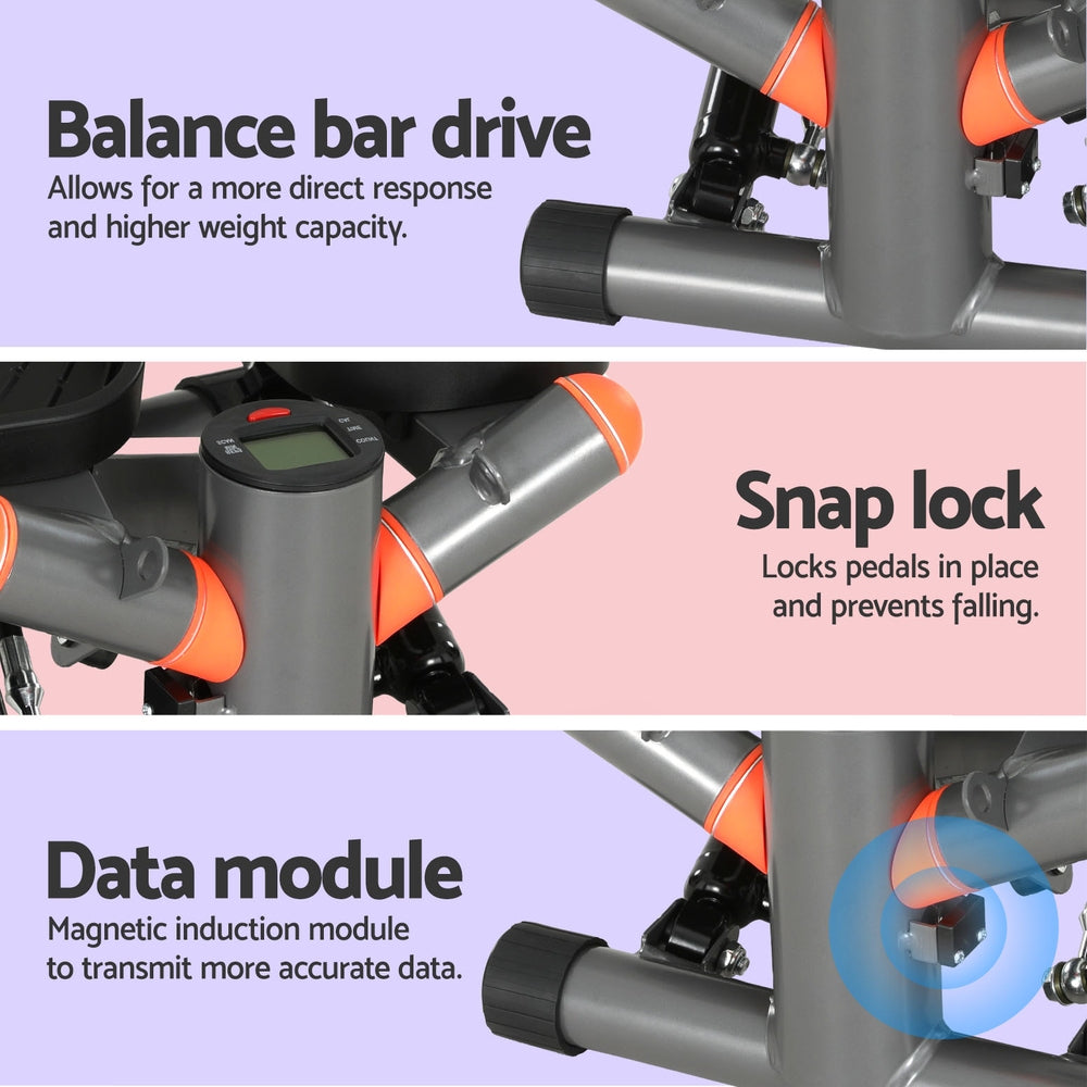 Step up your fitness game with a Mini Stepper from Everfit. Target your thighs, calves, waist and hips without leaving your home. The Mini Stepper is portable thanks to its miniature size, making it perfect for use under your desk, in the living room, or on the go. The stepper has an anti-slip pedal surface and edge for safety and stability, and your package includes a non-slip rubber mat to keep everything in its place. The stepper has a high weight capacity of 150kg and the upgraded mute ring design operates quietly for a pleasant exercise session that won’t disturb your guests or family. The LCD screen will show you all your fitness data as you exercise, and the detachable soft pedal pad is easy on your feet and easy to maintain. It requires no assembly and folds neatly away when not in use. Best of all, the stepper comes with two bonus resistance ropes so you can perform a variety of exercises. Get fit today from the comfort of your home or office with the versatile Everfit Mini Stepper.