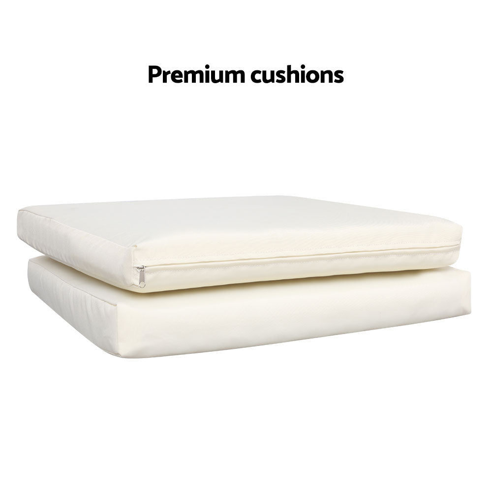 Enjoy the pleasant outdoors or have a nice chat with friends over a cuppa with the Gardeon 3-pc Outdoor Set. From the sturdy powder-coated steel framing and UV-resistant, water-resistant PE wicker to the extra 5cm thick cushions and 5mm tempered glass table top, this durable outdoor set provides a perfect complement to your deck, patio or balcony. Every inch of the Set is made with smooth lines and edges for an all-round and all-weather chic that spells comfort and style. Live life to the fullest and make it happen with the Gardeon 3-pc Outdoor Set.