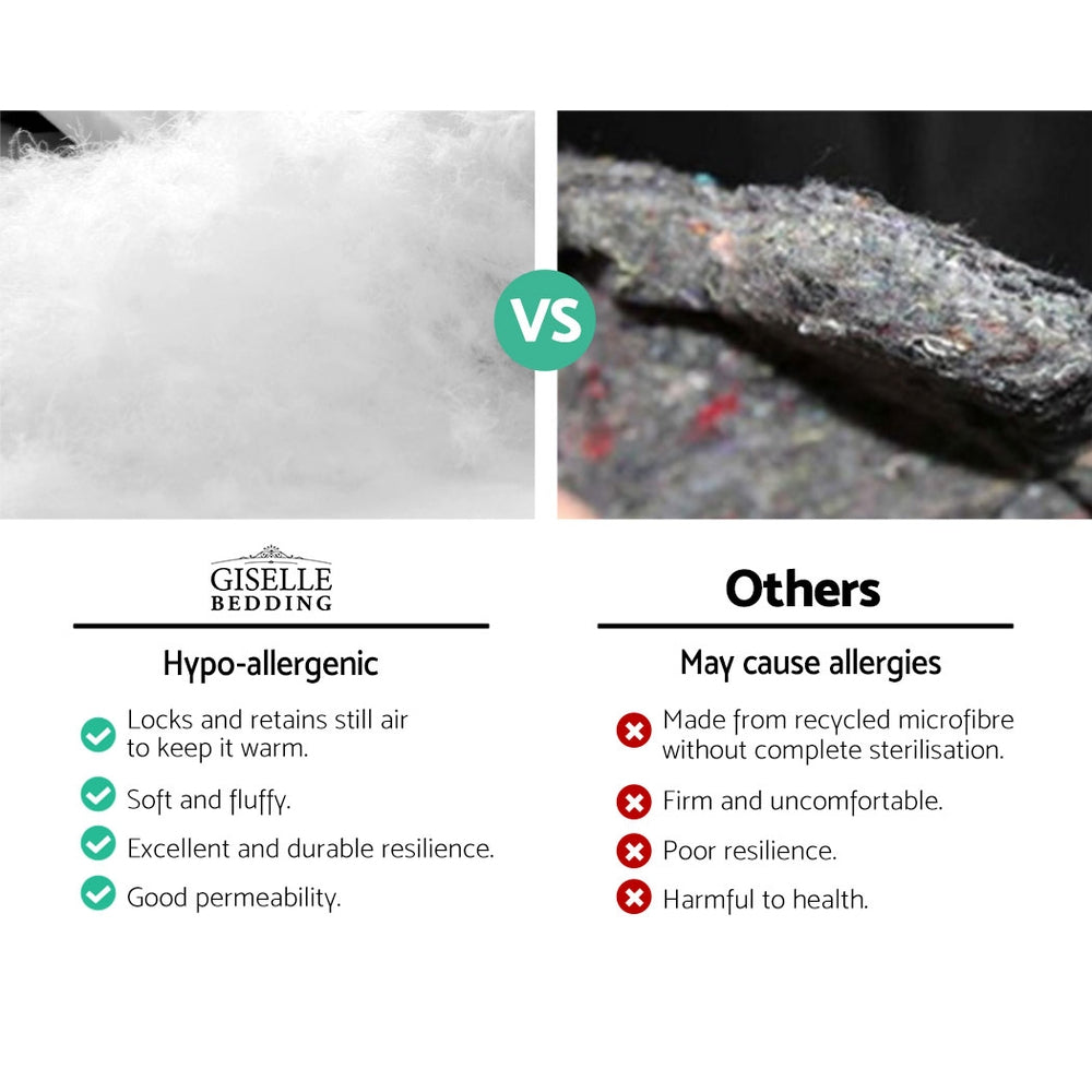 Having a good night's sleep is more than just having a great mattress. You need equally great pillows too. And our Giselle Bedding King Size Polyester Pillow is guaranteed to give you better sleep in more ways than one. First of all, the larger king size means the pillow provides better support all around, especially if you like to lean on the bedhead and do a bit of reading before you go to sleep. The polyester fibre filling is fluffy and soft, highly breathable and sweat absorbent to allow for a comfortable sleep all night long. The set of four pillows comprises two medium pillows and two firm pillows to accommodate every sleeping position. The medium pillow is good for back sleepers while the firm pillow suits side sleepers. Every pillow is housed in a 100% cotton cover that is soft to the touch and skin friendly. Perfect for your home or in commercial settings such as a hotel or Airbnb, our polyester fibre-filled pillow absolutely deserves a prime sleeping spot in any luxurious rest.