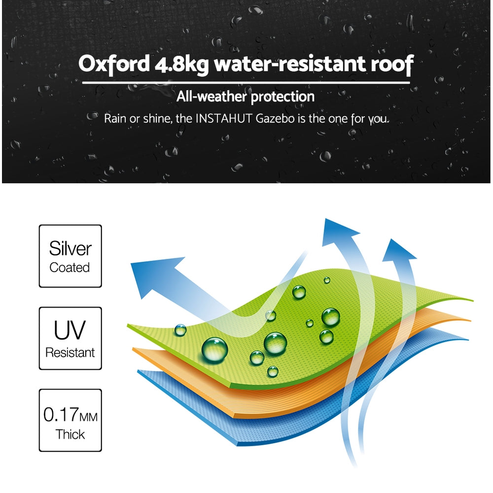 Featuring high density, long lasting PU-coating oxford fabric with effective UV and water repellent treatments, this INSTAHUT 3X4.5m Pop Up Gazebo provides a lovely ground and canopy coverage of 300 x 450cm. It is perfect for all your upcoming outdoor activities, as a sunshade station as well as a shelter for unexpected rains.