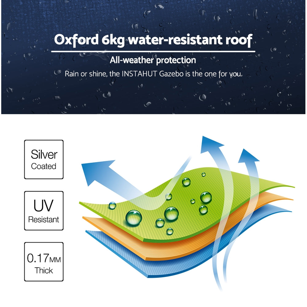 With a wide roof coverage of 300cm by 600cm, the exceptional 6kg cover is made of durable PU coating Oxford fabric that's both UV and water resistant. No more worries about being too hot or too wet, you can get your event going with total peace of mind from the elements. Giving you ample dry cover from rain and adequate protection from UV radiation.